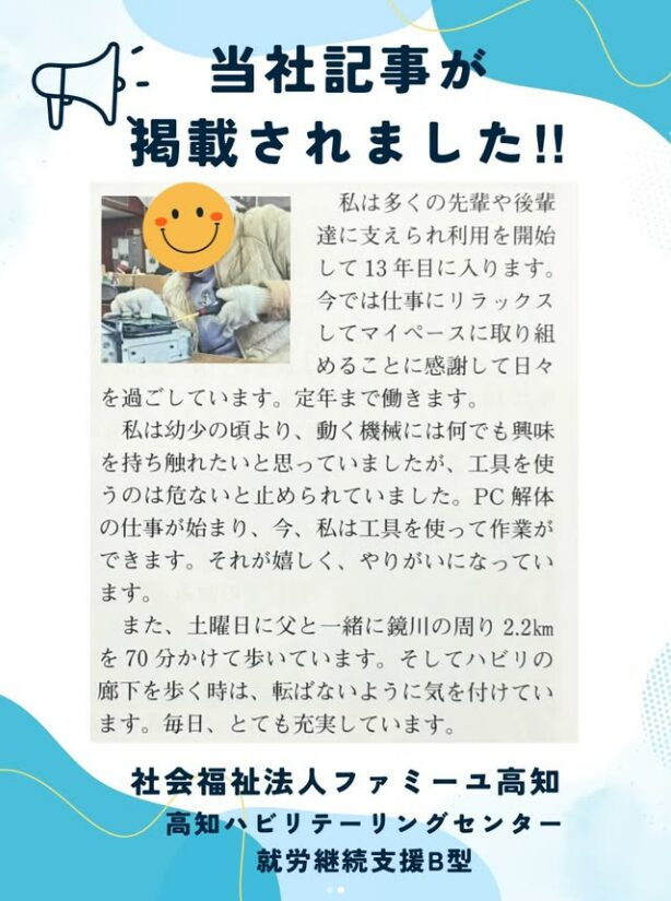 【当社取り組みが掲載】高知ハビリテーリングセンター様の広報誌に当社取り組みが掲載されました